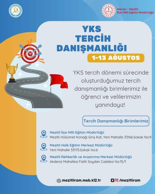 Öğrencilerimizin doğru ve bilinçli tercihler yapabilmeleri için rehber öğretmenlerimizle; Mezitli İlçe Milli Eğitim Müdürlüğü (Mezitli Hükümet Konağı), Mezitli Halk Eğitimi Merkezi ve Mezitli Rehberlik ve Araştırma Merkezinde danışmanlık hizmeti verilecektir.